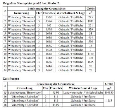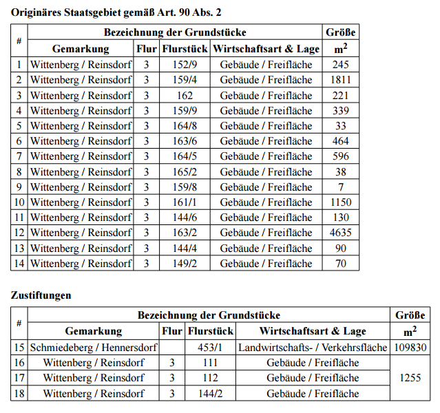 Was fällt auf? Das 9 Hektar (90.000 m²) große Kankenhausgelände in Apollensdorf wird nicht genannt, nur Flächen in Reinsdorf! Auch nicht in einer Version dieser Aufstellung von 2013, in der zusätzlich die Zustiftungen genannt werden: