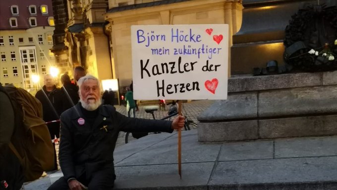 Daneben schreibt eine Frau mit vielen Ringen an ihren Fingern in ihr Tablet in eine Telegram-Gruppe: „Gleich kommt Höcke. Stimmung gut.“ Eine andere Nutzerin in der Telegramgruppe schreibt, dass sie Österreicherin sei, aber Dresden aus der Ferne unterstütze. „Österreich gehört zu Deutschland. Du bist auch Deutsche“, antwortet jemand darauf. Darunter postet ein anderer das Foto eines grinsenden Hais. Und wieder ein anderer erzählt davon, wie er NVA-Wachdienst an der deutsch-deutschen Grenze gehabt hätte. „Wir mussten nicht schießen. Wir haben die, die in die Minen getreten waren, da rausgeholt. Die sind meistens verblutet, und wir haben dann drei Tage frei gekriegt nach so einem Vorfall.“