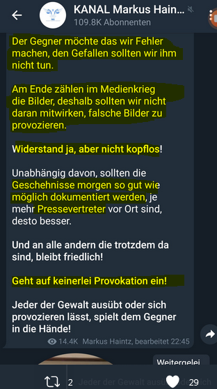 Viele sind ja nicht mehr von denen da, die ohne Bilder für den Medienkrieg produzieren zu wollen, nur demonstrieren. Um so wichtiger ist es, friedlich zu bleiben.