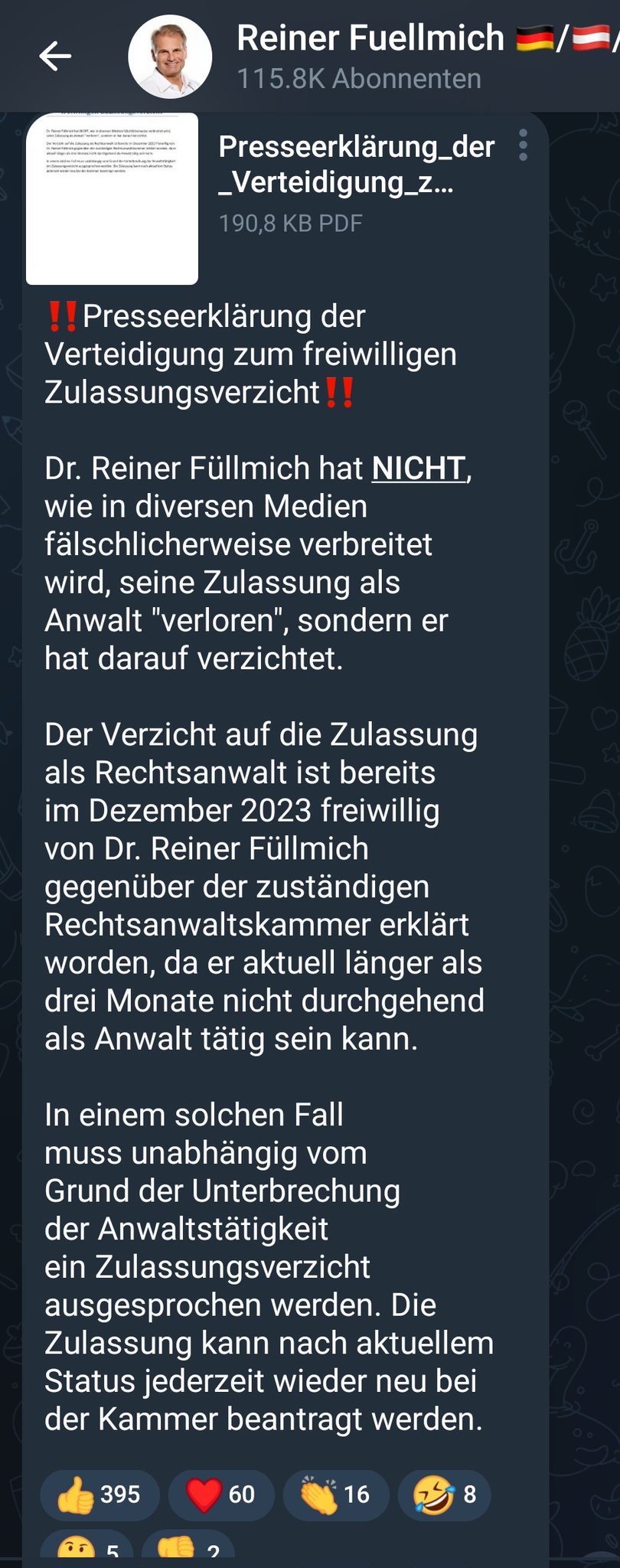 Er wird die Zulassung nicht wieder beantragen, da bin ich ganz sicher. Wenn dieser Prozess gelaufen ist, wird er kein Anwalt mehr sein können.