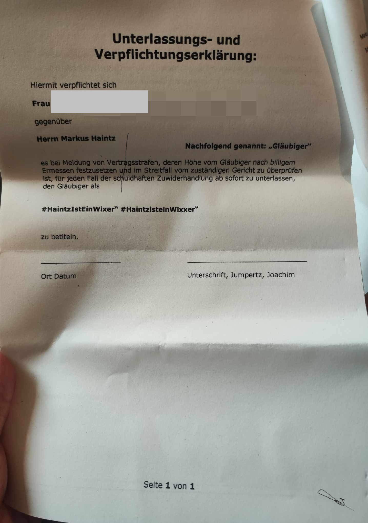 glänzt erneut mit juristischen Spitzfindigkeiten. Mit Schreiben vom 24.10.22 hat er einer Mitstreiterin unserer Bubble eine Unterlassungserklärung zugestellt. Dumm nur, das ich im Unterschriftenfeld eingetragen bin. Somit konnte sie von der Empfängerin nicht unterschrieben werden. Nun hat der Winkeladvocat mit Schreiben vom 06.06.24 eine Zivilklage gegen sie eingereicht. Als Beweismittel fügte er die nicht unterschriebene Unterlassungserklärung hinzu…