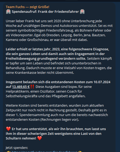 Insgesamt belaufen sich die entstandenen Kosten zum 10.07.2024 auf 13.469,65 € Diese Ausgaben sind bspw. für seine Heilpraktikerin, einen Oszillator, seinen Coach für