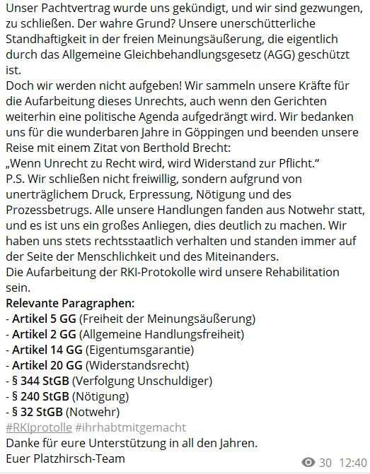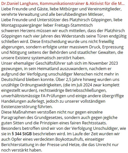 Der Platzhirsch in Göppingem, eine von Greulichs Empfehlungen, ist endgültig Geschichte. Hoffentlich bekommt Fink seine Kochbücher - Kommisionsware - noch zurück.