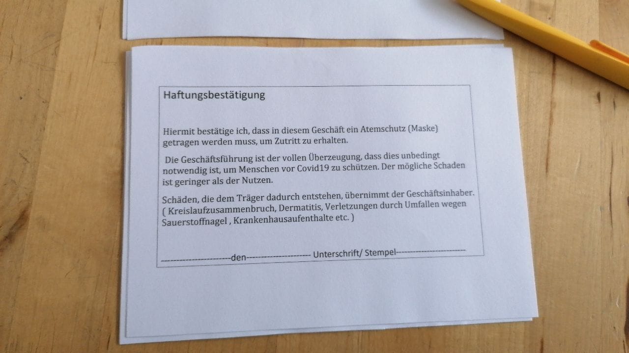 "Da mir ihre Gesundheit natürlich sehr am Herzen liegt, können sie natürlich auf das tragen einer Maske verzichten. Sie müssten allerdings nur noch schnell folgende Erklärung unterschreiben"