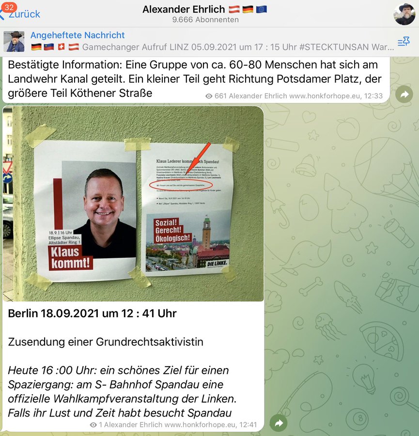 https://twitter.com/SchwarzePalmen/status/1439193376595877890Alexander Ehrlich versuchte derweil auf Telegram, die Organisation der Revolution an sich zu reißen. Er stellte messerscharf fest, dass die Antifa sie beobachten würde.