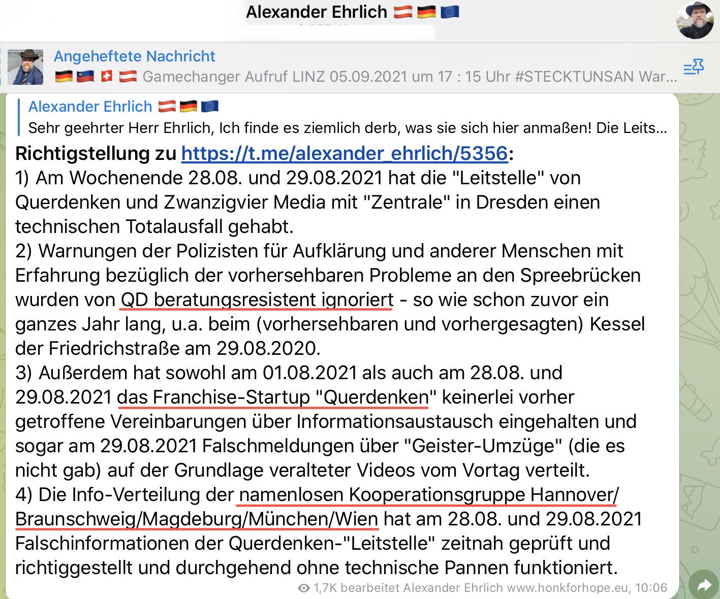 https://twitter.com/freiebuergerks/status/1439237060431392770#B1809 Der Koordinationskanal von #AlexanderEhrlich #HonkForHope gibt auf.