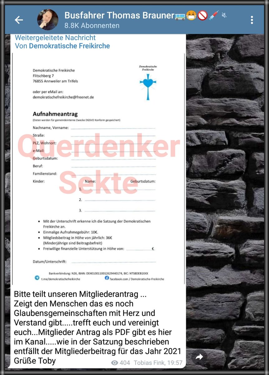 Die "Demokratische Freikirche" nimmt Fahrt auf - und Mitgliedsbeiträge ein: 10 € Aufnahme + 36 € Jahresbeitrag für juristisch fragwürdige Maskenallergiebescheinigungen, Minderjährige sind beitragsfrei...