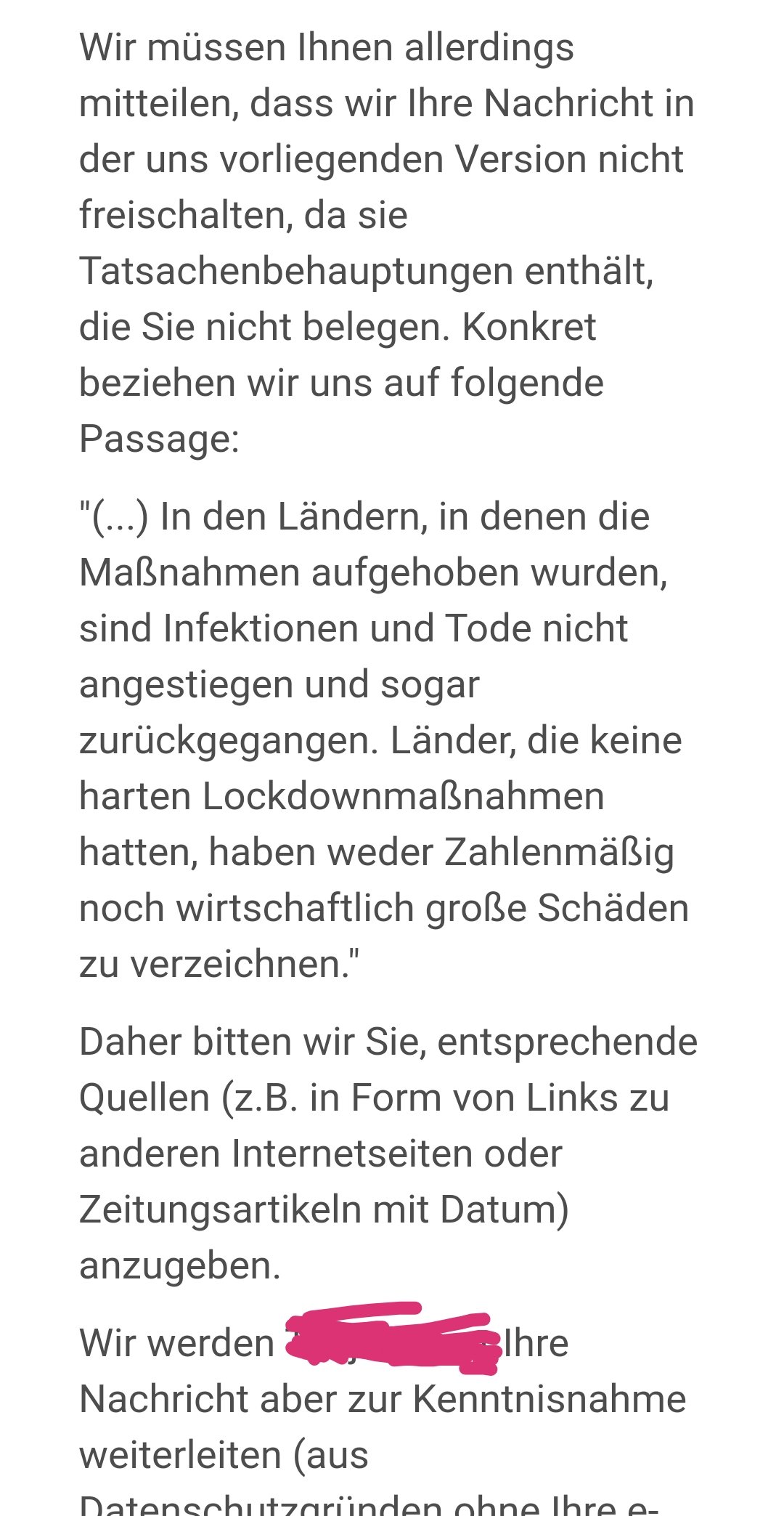 Sie schrieb eine Antwort die nicht belegt werden kann und deshalb nicht freigeschaltet wird. Mir wurde aber ihre Antwort zugesendet