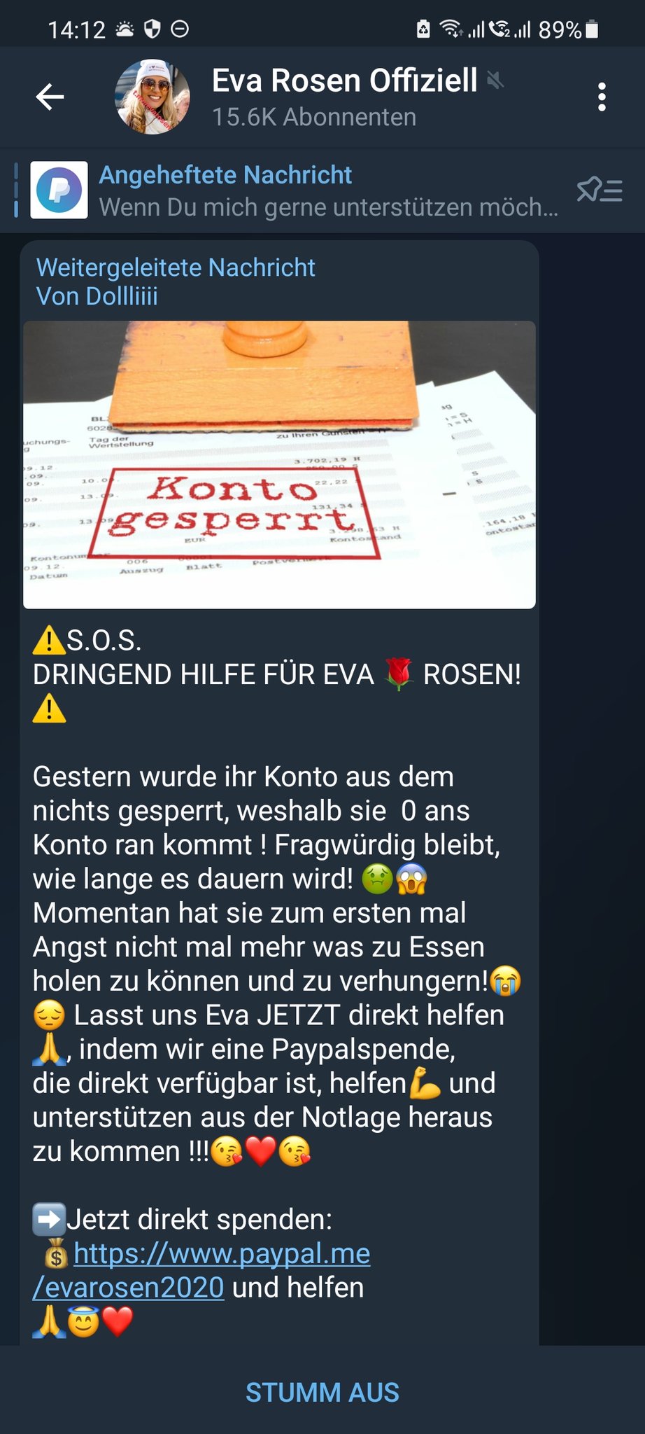 Eva scheint das Mimimi auf TG gelöscht zu haben, das Bild finde ich nicht mehr. Vielleicht ist ihr Aufruf gegenüber der Szene rufschädigend, denn unter Konto"sperre" würde ich einen regulären Vorgang im Zusammenhang mit regelmäßiger Ausgaben, z. B. Miete, Hund und (nicht?) gefülltem Kühlschrank vermuten.