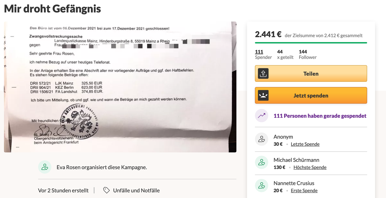 Das ist noch etwas anderes. Haintzel hat ihr eine letzte Mahnung über 7xx Euronen geschickt. Da hat sie sich über gofundme 1020€ erbettelt. Diese Kampagne wurde wohl inzwischen gelöscht. Die 500 Euro kann sie zahlen, um die Erzwingungshaft (in Frankfurt) abzuwenden. Die ursprüngliche Forderung kommt aus Braunschweig von der Staatsanwaltschaft und hat mit dem Haintzelmann nichts zu tun.