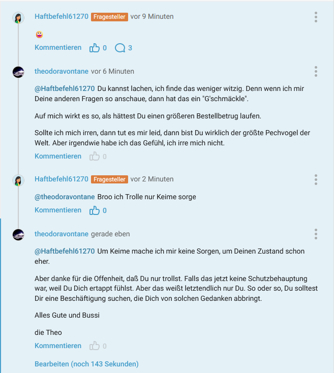 Der "Haftbefehl" hat einen besonderen Humor, sagt er. Er legt einen vermutlichen Bestellbetrug offen und erklärt dann, er würde nur trollen.